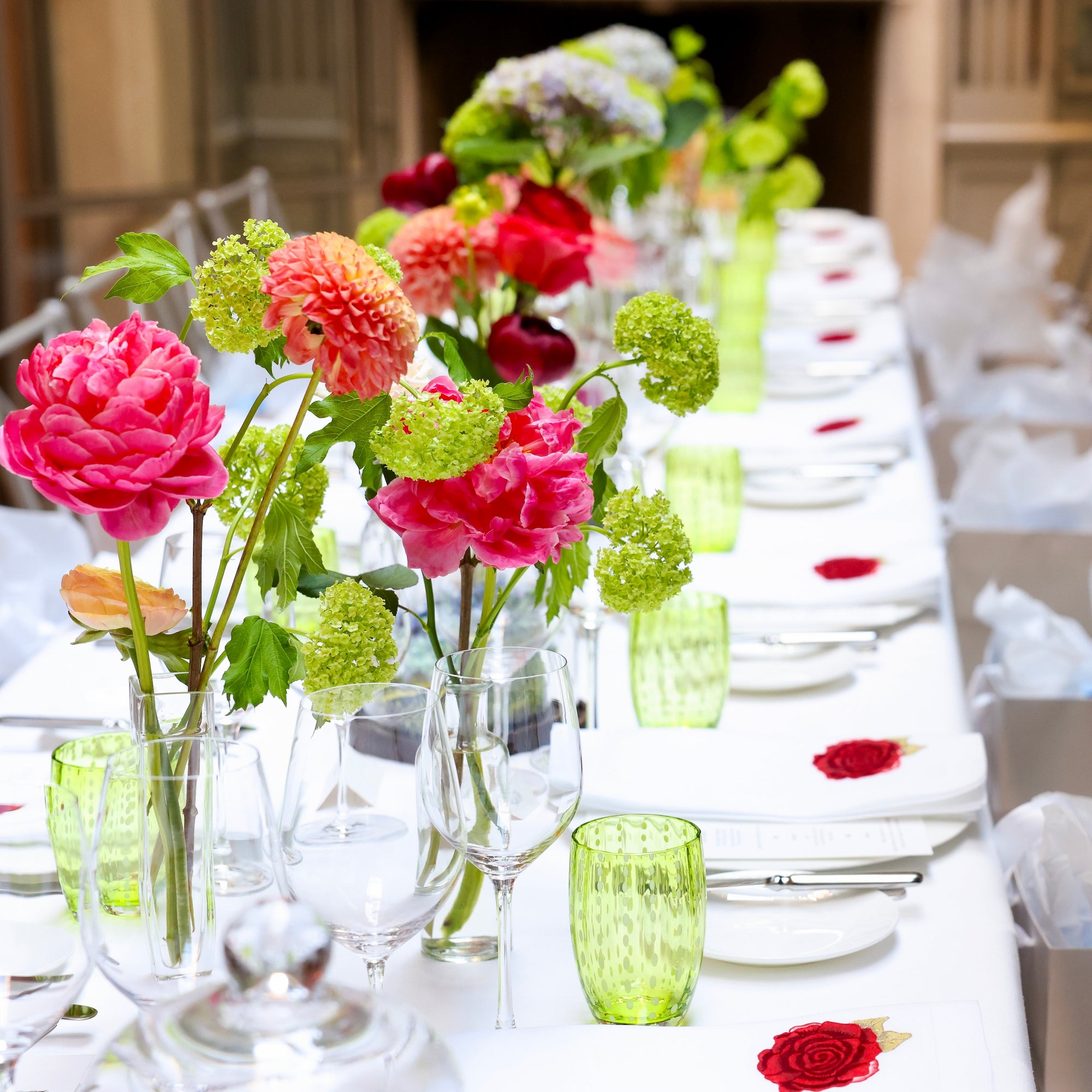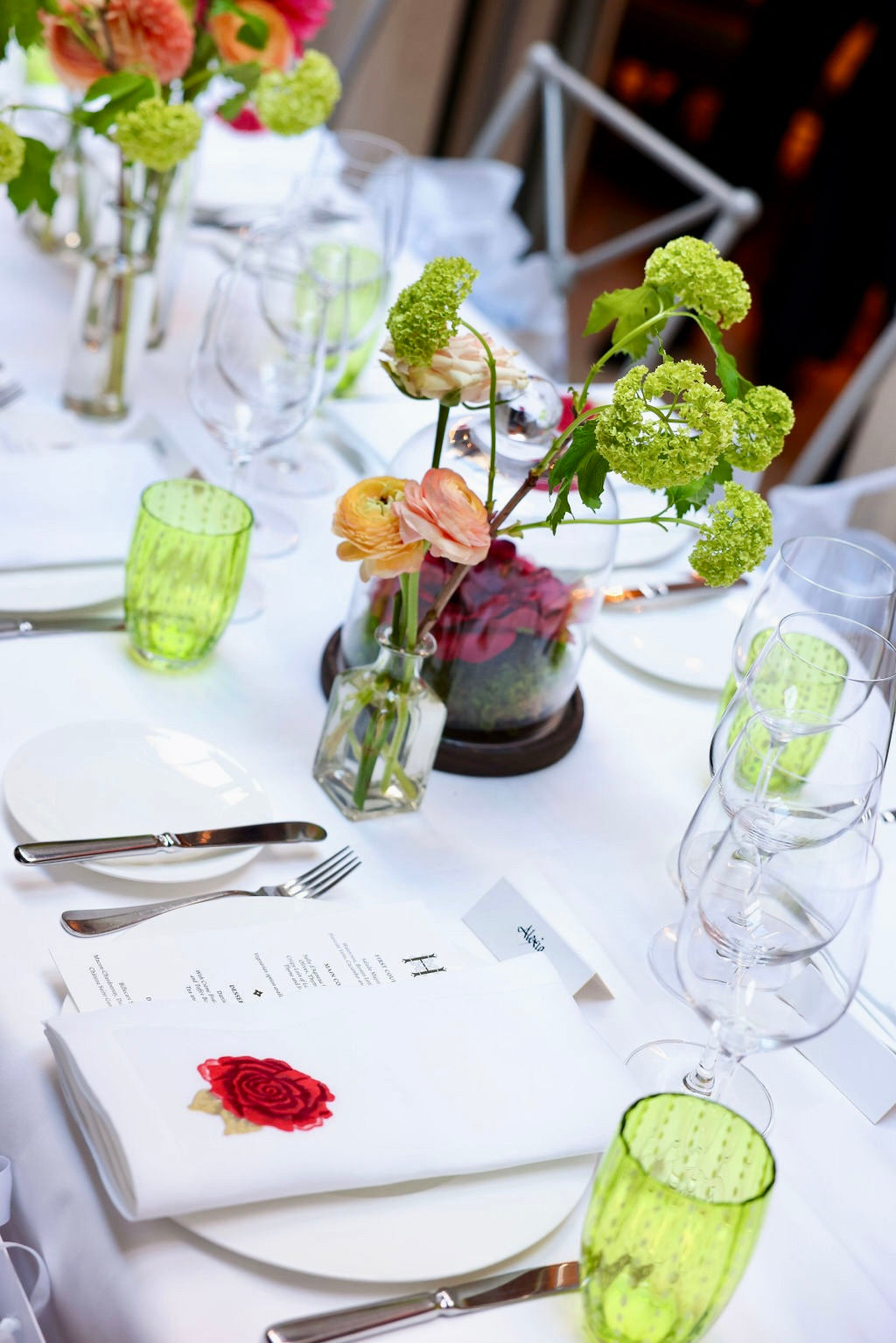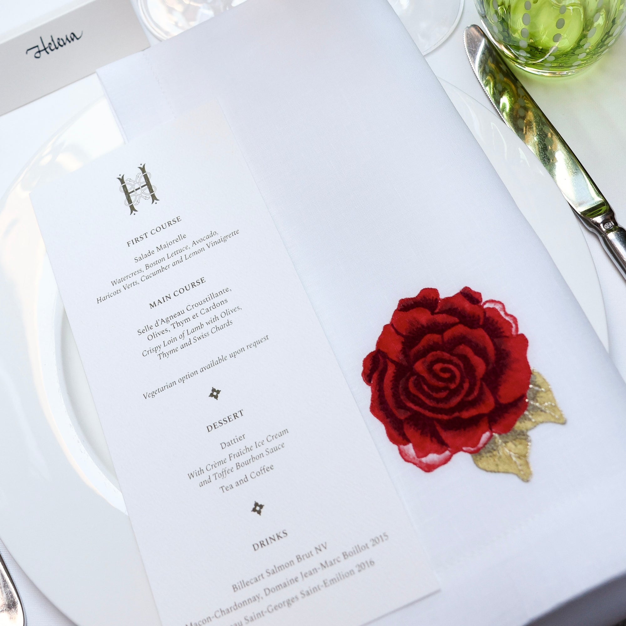 Our custom linen napkins, created by E. Braun, featured the iconic crimson Large Red Rose brooch. They were the perfect finishing touch to the tablescape at our debut luncheon.