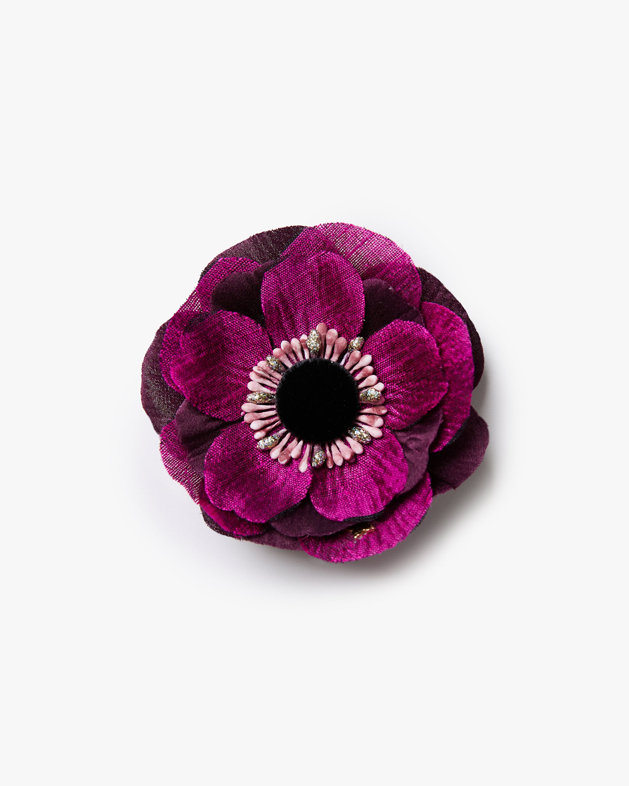 Handcrafted with magenta silk charmeuse and aubergine silk shantung petals, this vibrant flower showcases a mix of hand-dyed pink and silver crystal stamens surrounding an ebony velvet button.