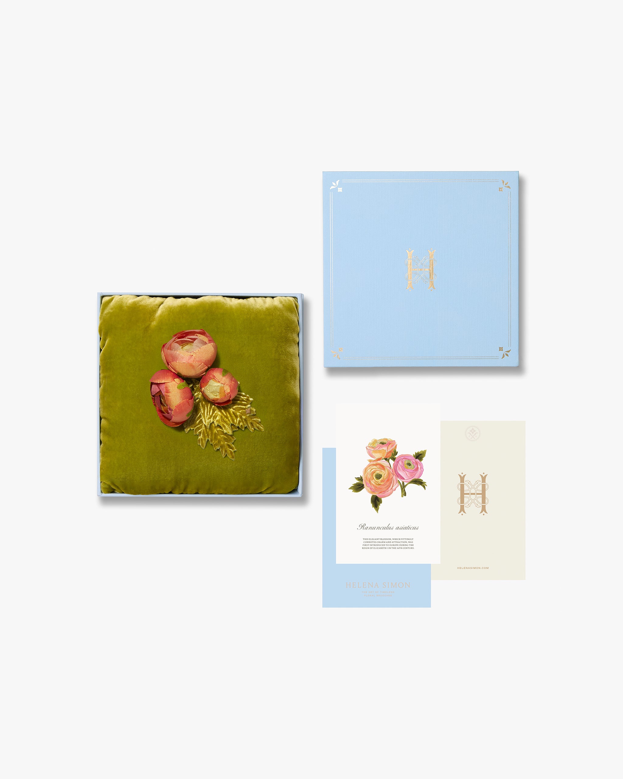 Embellished with silk velvet leaves, three cheery ranunculus blooms, composed of pastel pink, yellow and orange silk shantung, silk habotai and silk chiffon petals, capture the delightful essence of this popular flower.