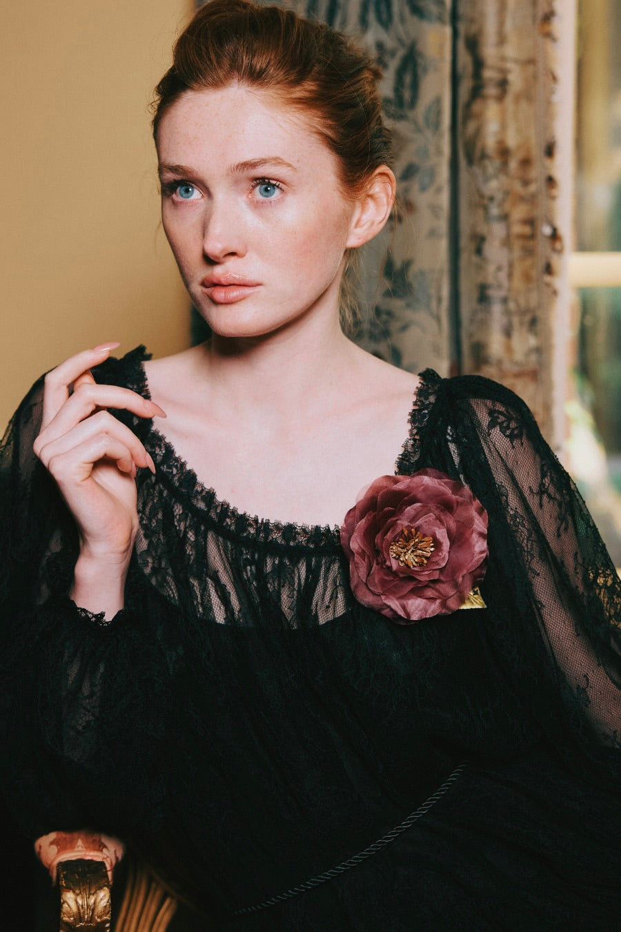 This delicate autumnal bloom is lovingly handmade with hand-dipped bronze and gold stamens, layers of hand-dyed mauve silk habotai, silk organza and silk crinkle chiffon, and features two chartreuse green silk velvet leaves.