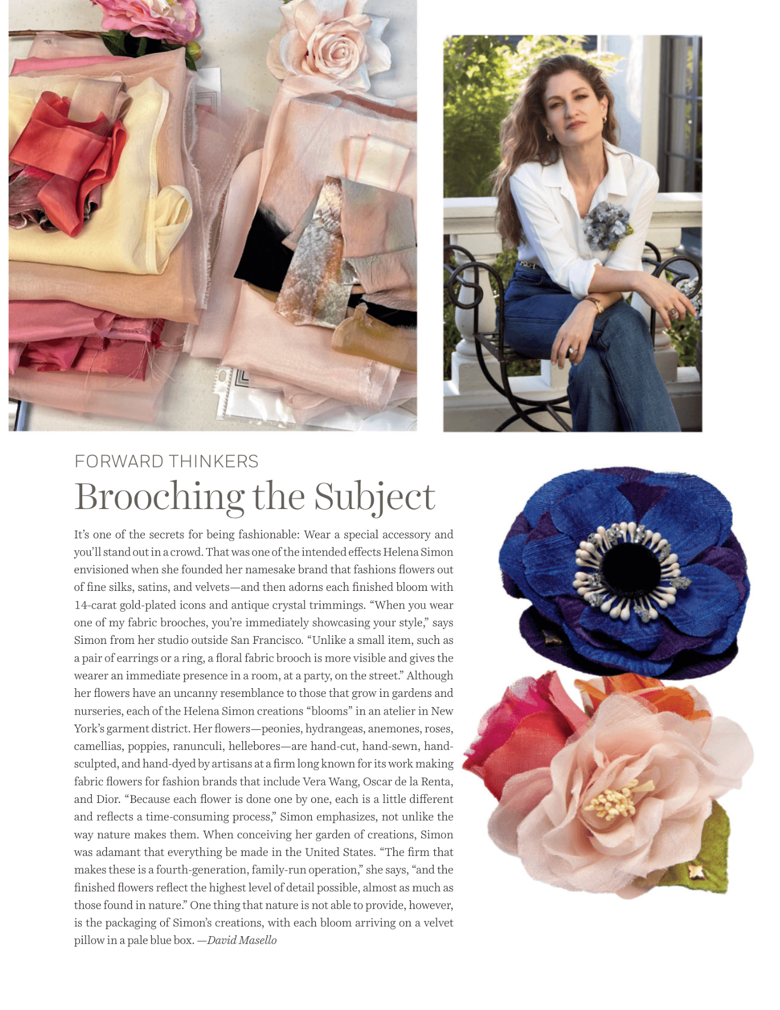 “My mother wore an oversized floral brooch and a smile everyday. This Helena Simon brooch reminds me of her - colorful, elegant, and happy! Feels like spring everyday!”