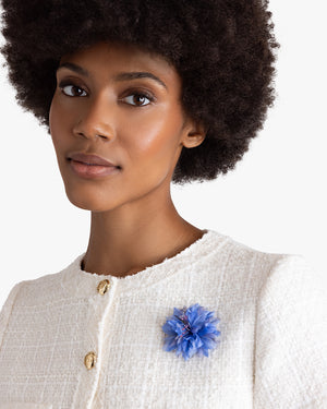 Handcrafted with cornflower blue silk habotai, fuschia cross-dyed silk chiffon, blue silk charmeuse and silk shantung petals, this vibrant flower showcases a mix of black and rosy pink stamens.