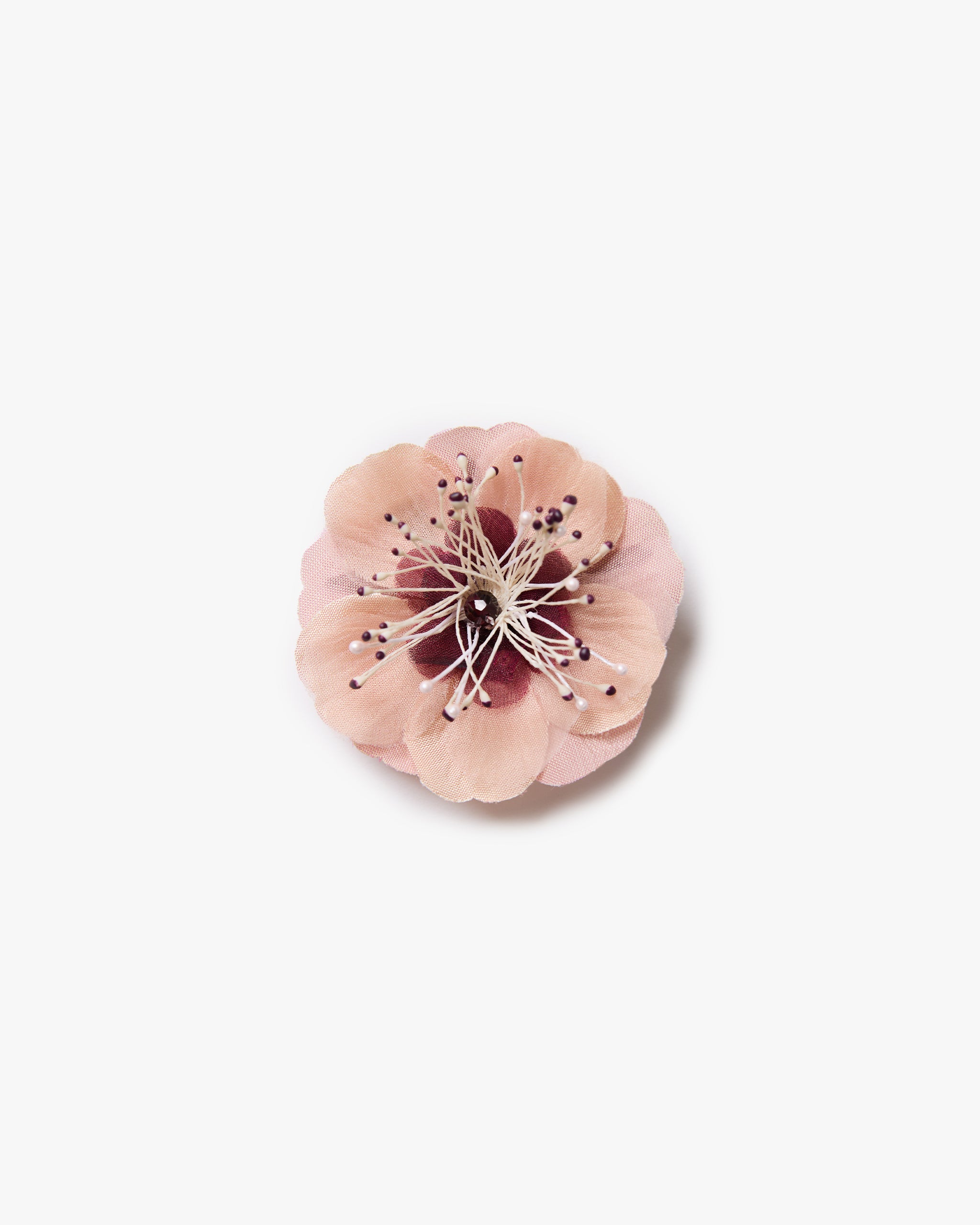 Centered with a garnet stone and hand-painted ivory and brown stamens, a combination of delicate pale pink silk cross-dyed dupioni, blush silk organza, and cranberry silk chiffon petals are backed with a burgundy silk charmeuse spray.