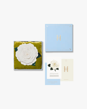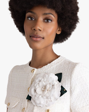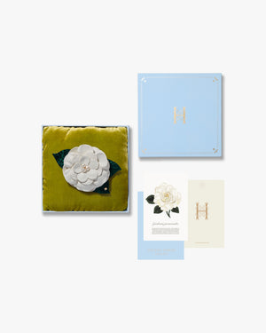 Lovingly handcrafted with white leather petals and crepe back satin, this striking bloom features emerald green silk velvet leaves and is centered with three delicate freshwater pearls.