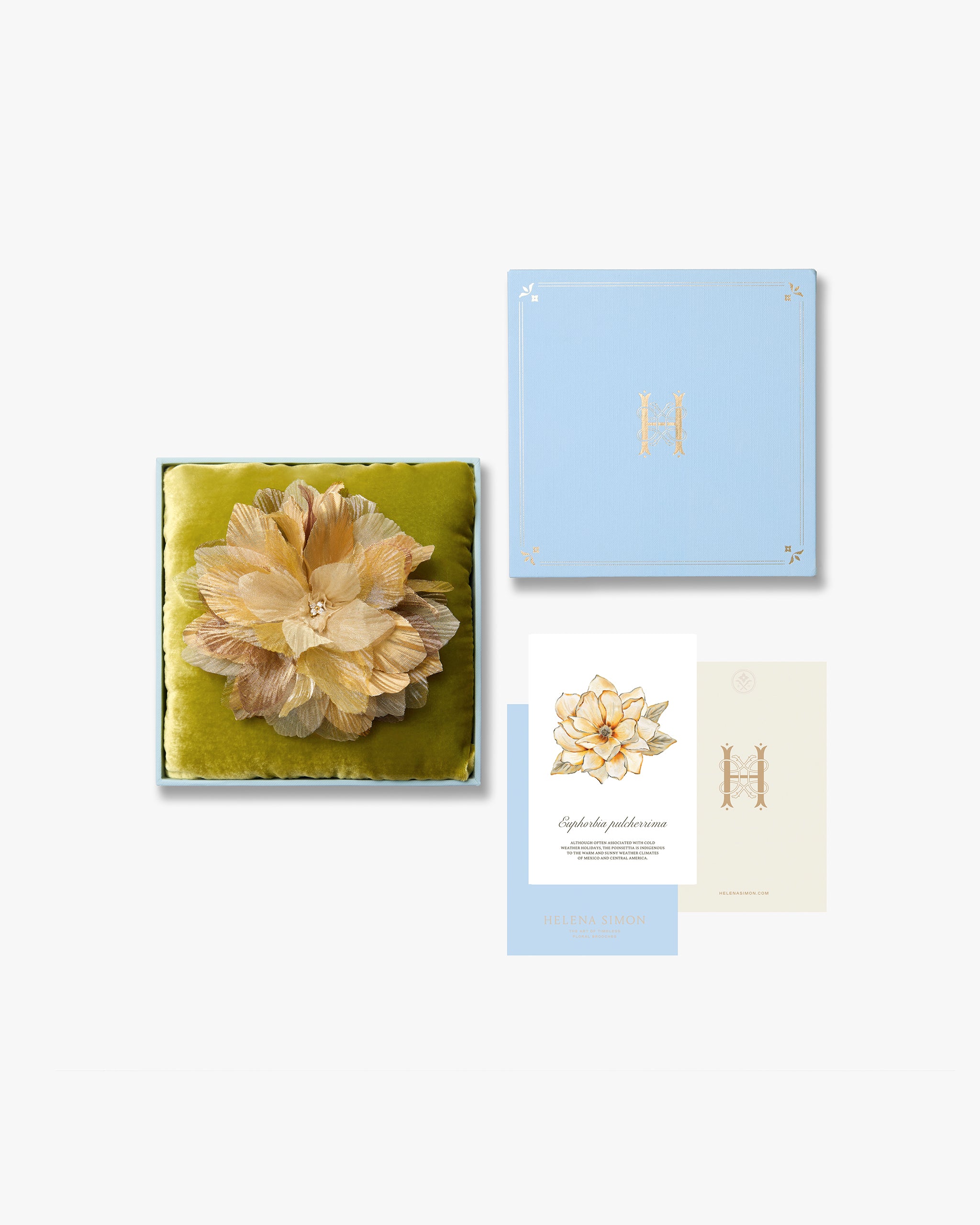 Each brooch will arrive on a velvet pillow inside a gold-embossed pale blue box making for a lovely gift presentation or a keepsake to beautifully display your own floral brooch.