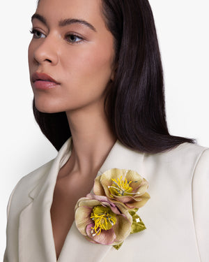 Adorned with silk velvet leaves, this elegant brooch features two silk habotai blossoms - one hand-dyed purple and one hand-dyed pink - with a combination of green, yellow and pearl stamens.