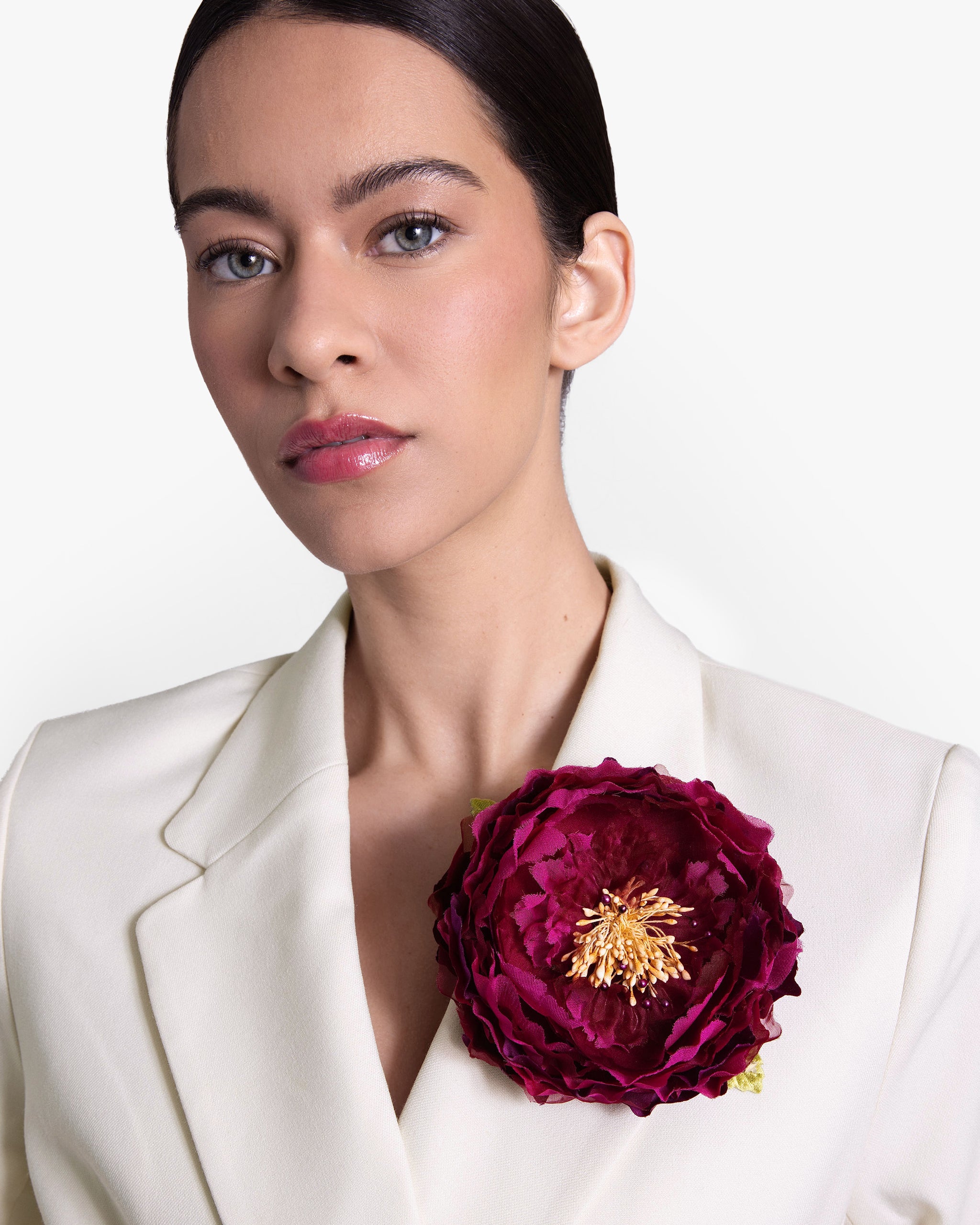 Layers of magenta silk organza, silk habotai, silk chiffon and silk duchess satin capture the essence of this lush flower, which is embellished with pink pearled stamens and silk velvet leaves.
