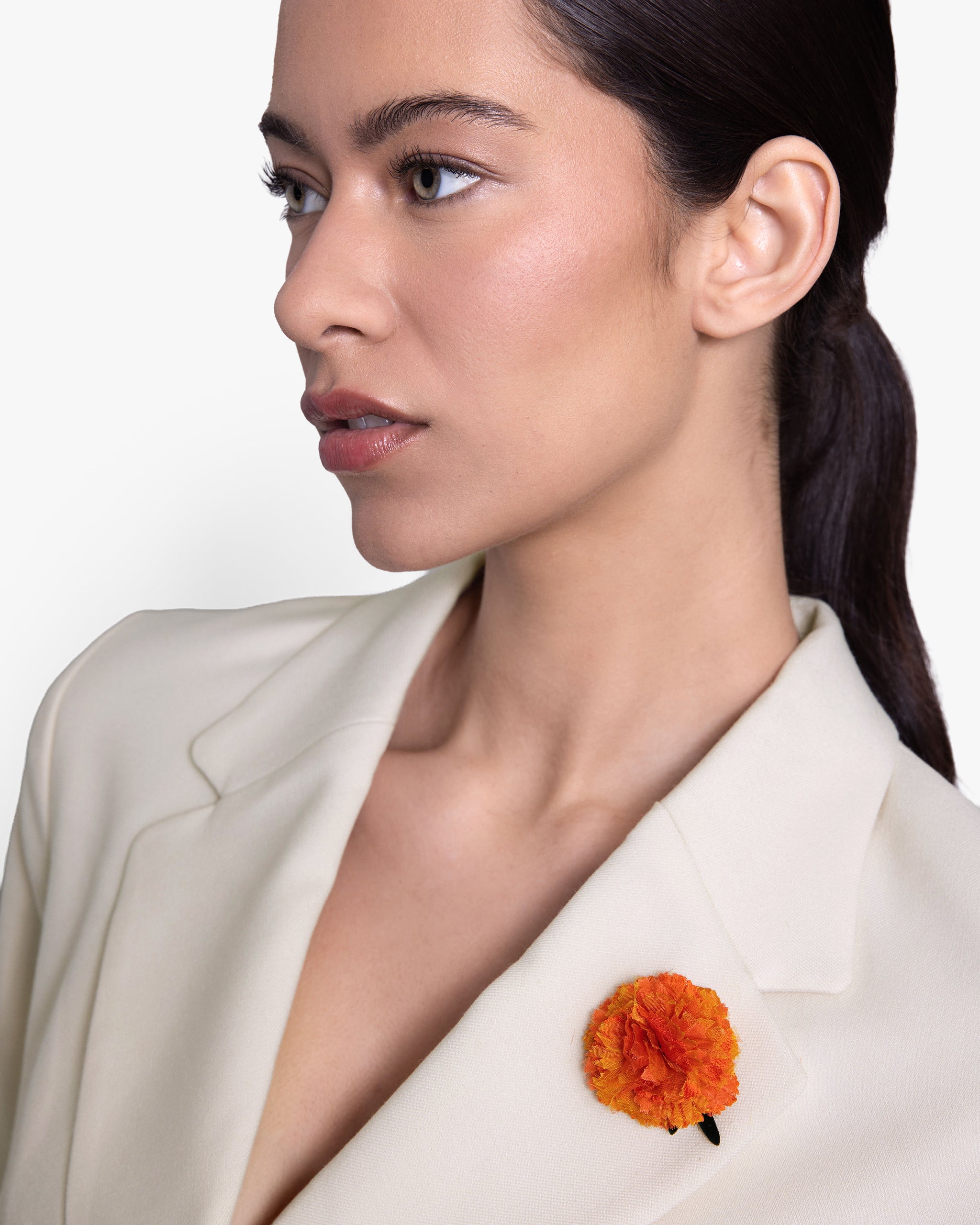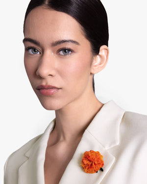 This bright bloom is lovingly handmade with orange crepe back satin, cross-dyed silk taffeta, cross-dyed silk chiffon, and silk satin face organza petals, and features emerald green silk velvet leaves.