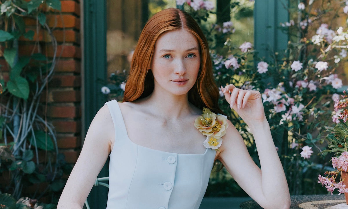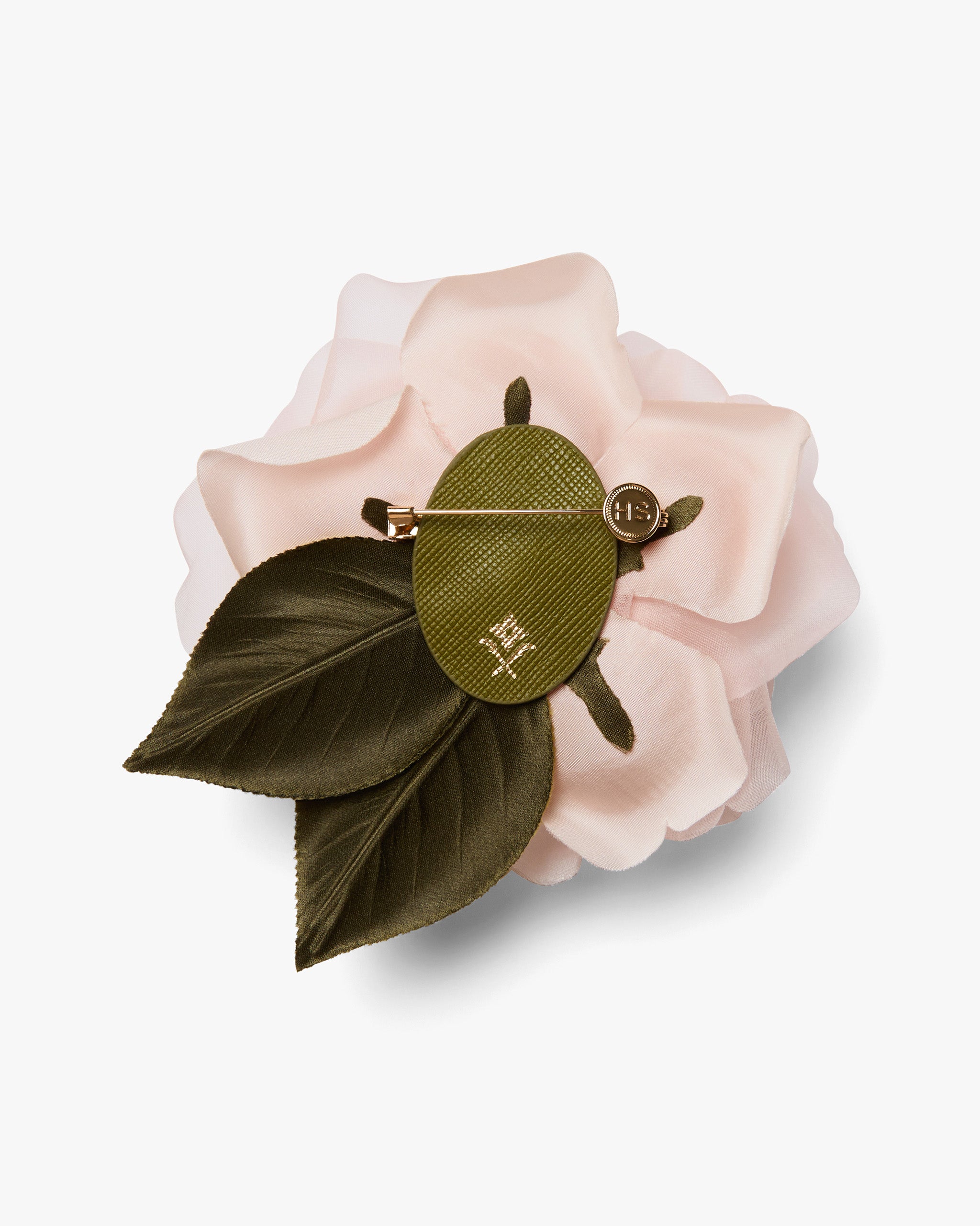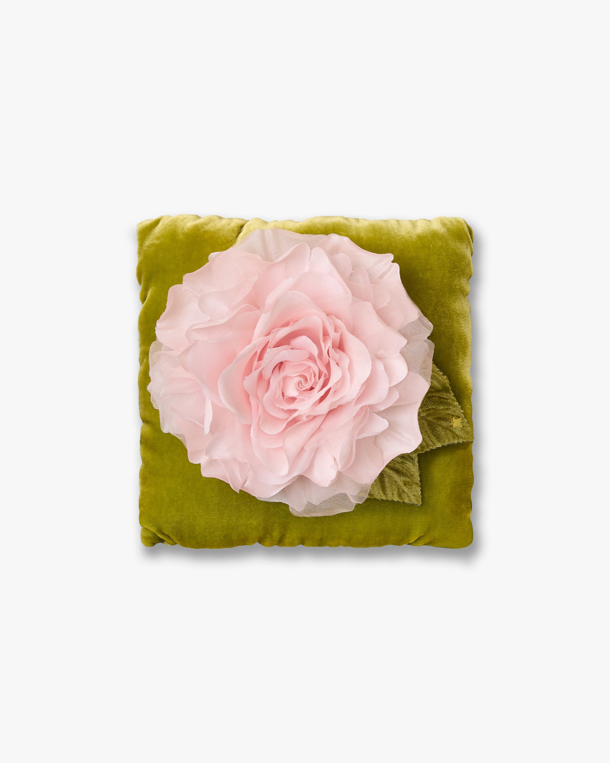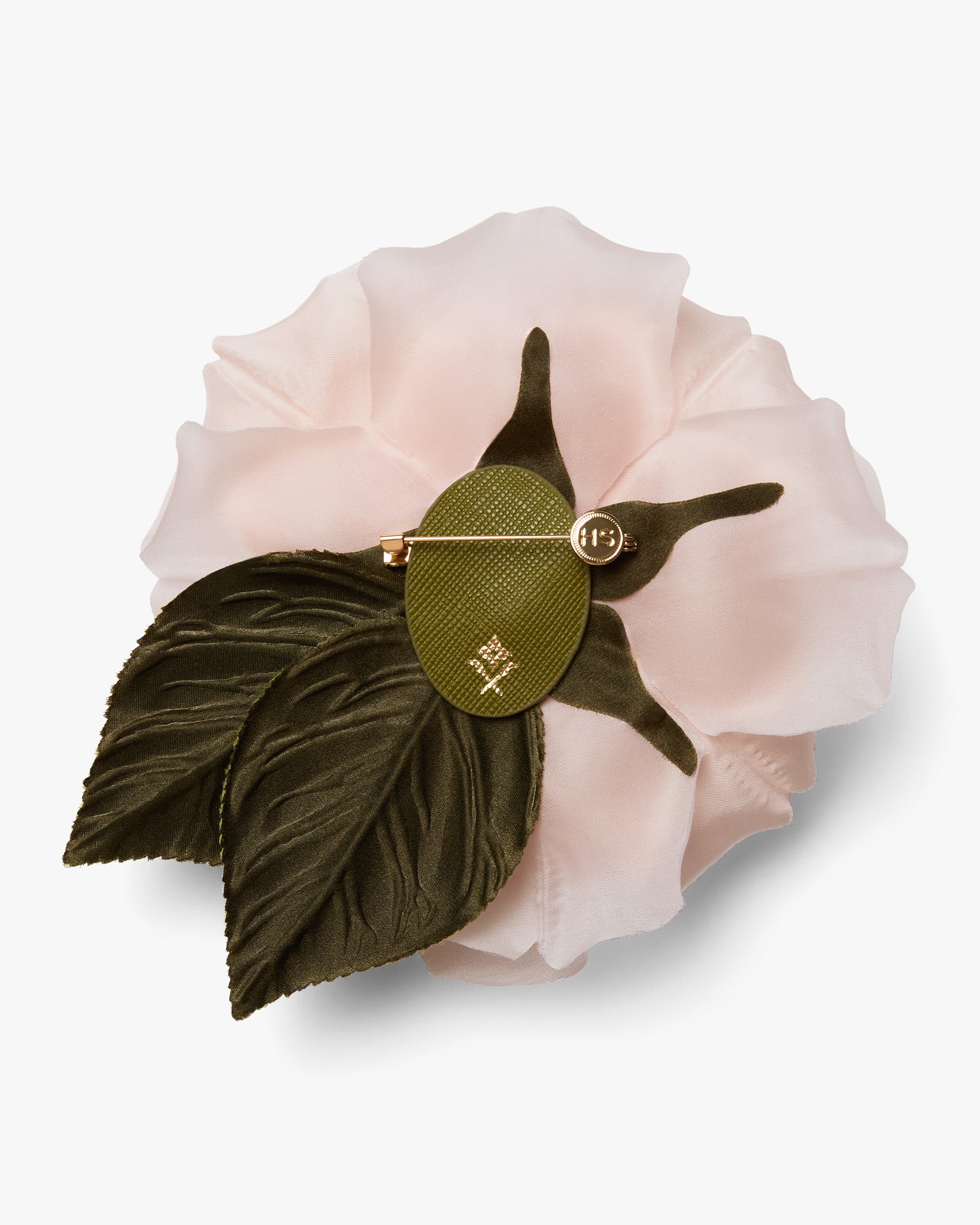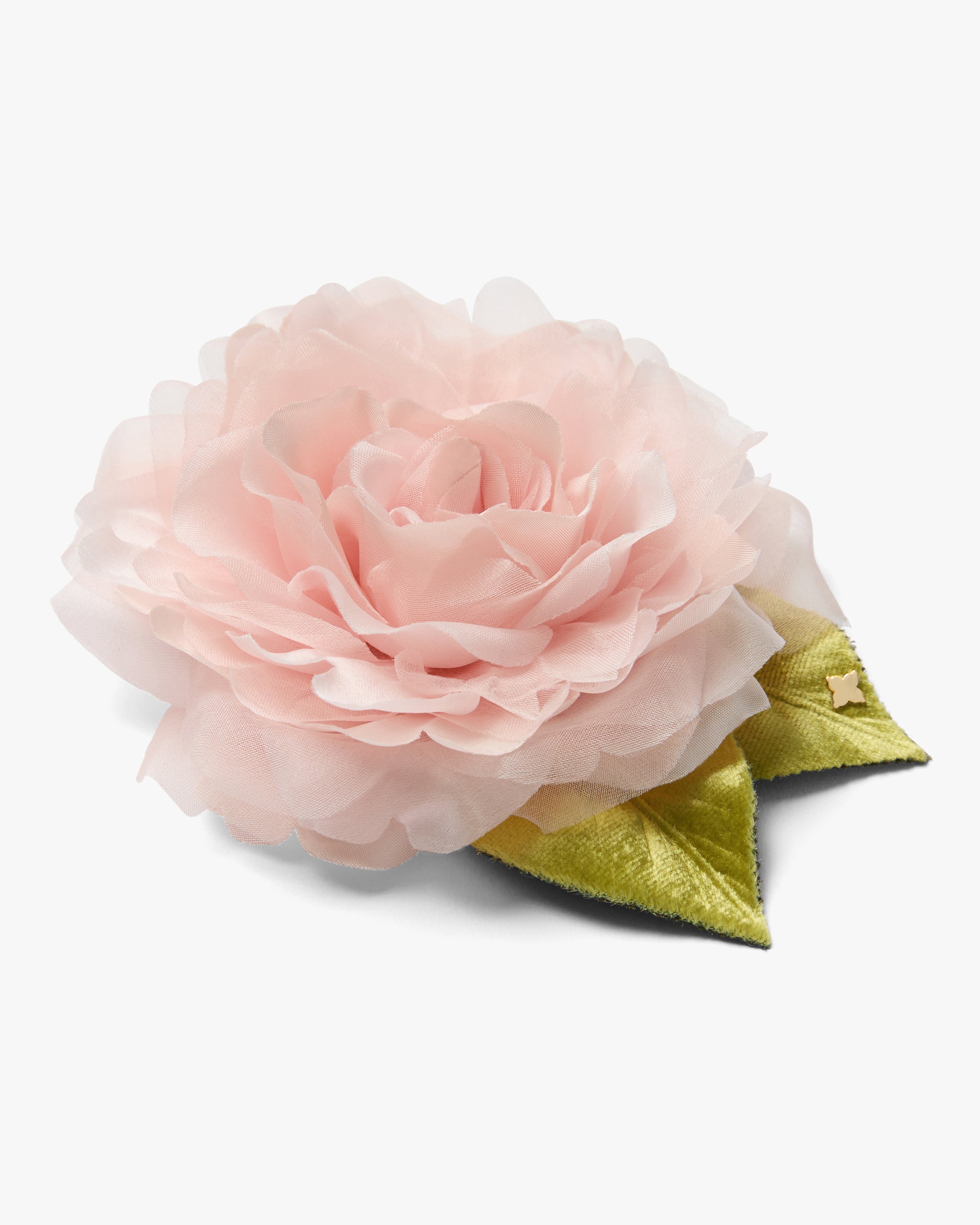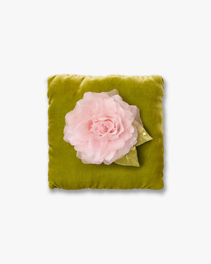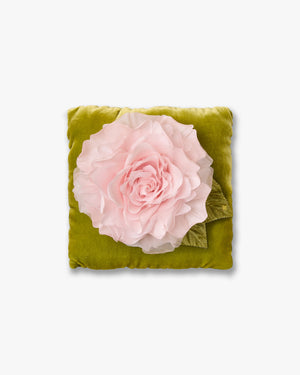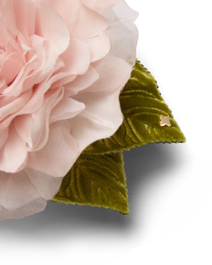 This delicate bloom is lovingly handmade with ballerina pink silk taffeta, silk satin face organza, and silk organza petals and features chartreuse green silk velvet leaves.