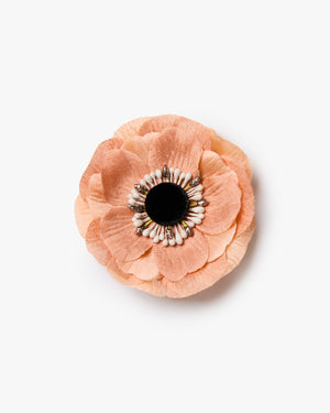 Handcrafted with pale peach silk charmeuse and silk shantung petals, this vibrant flower showcases a mix of hand-dyed ecru and gold crystal stamens surrounding an ebony velvet button.