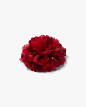 This exquisite bloom is lovingly handmade with lush layers of scarlet red cross-dyed silk iridescent chiffon, silk taffeta and silk organza.