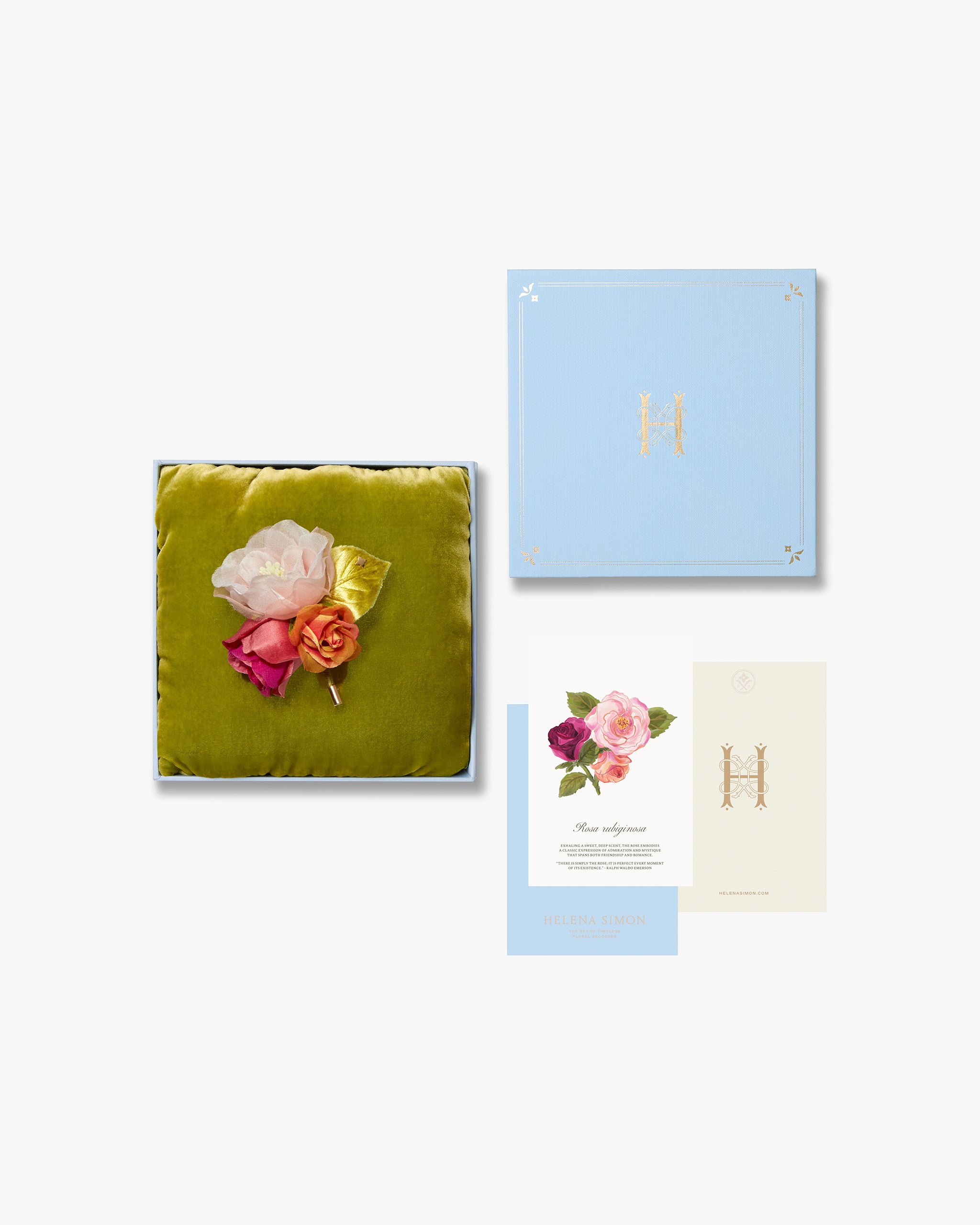 This exquisite brooch features silk velvet leaves and three delicate roses - yellow, pale pink, and blush pink - all lovingly handcrafted from a mix of silk crinkle chiffon, silk habotai, silk organza and silk shantung.