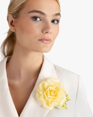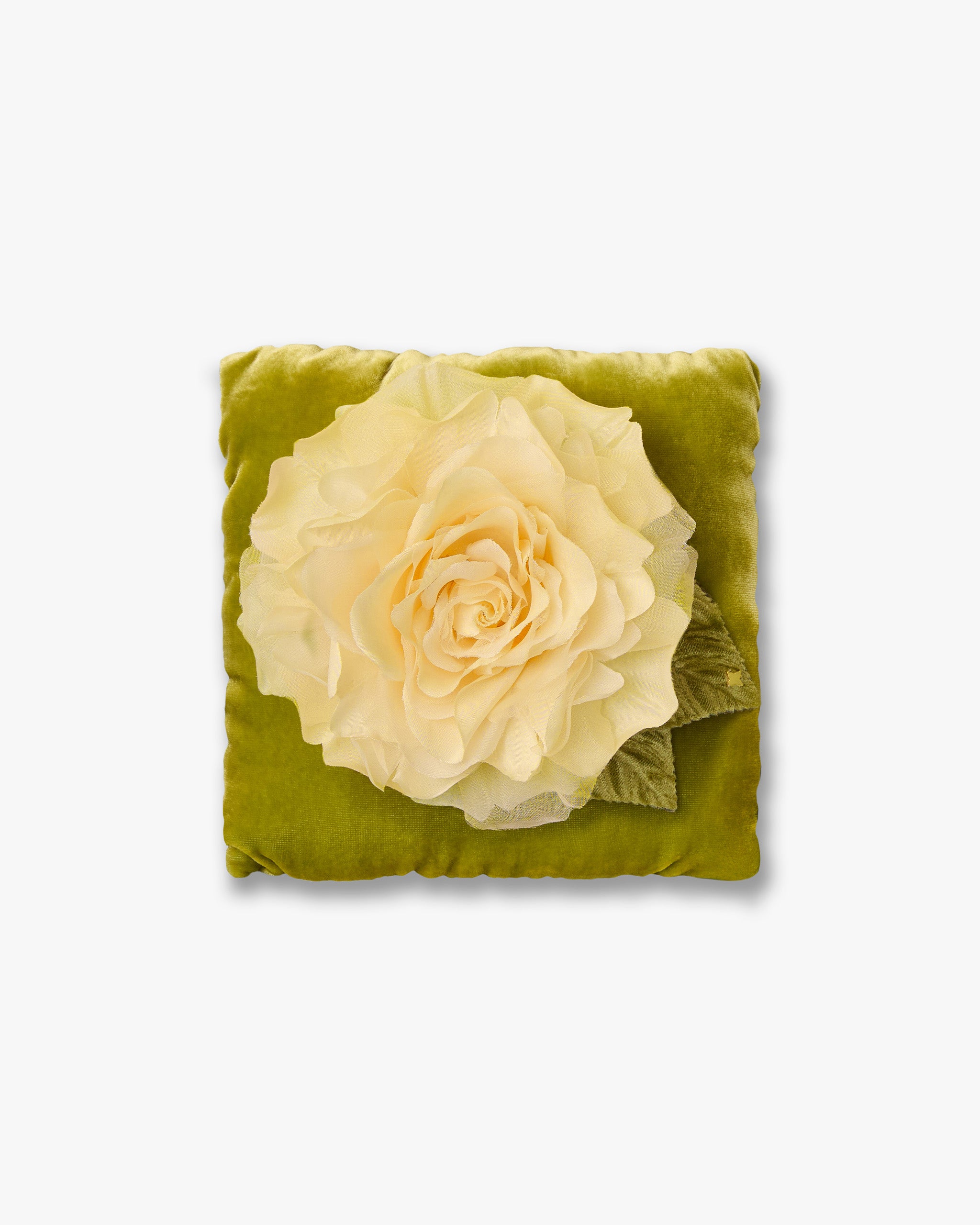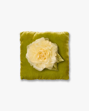 This delicate bloom is lovingly handmade with ballerina pink silk taffeta, silk satin face organza and silk organza petals, and features chartreuse green silk velvet leaves.